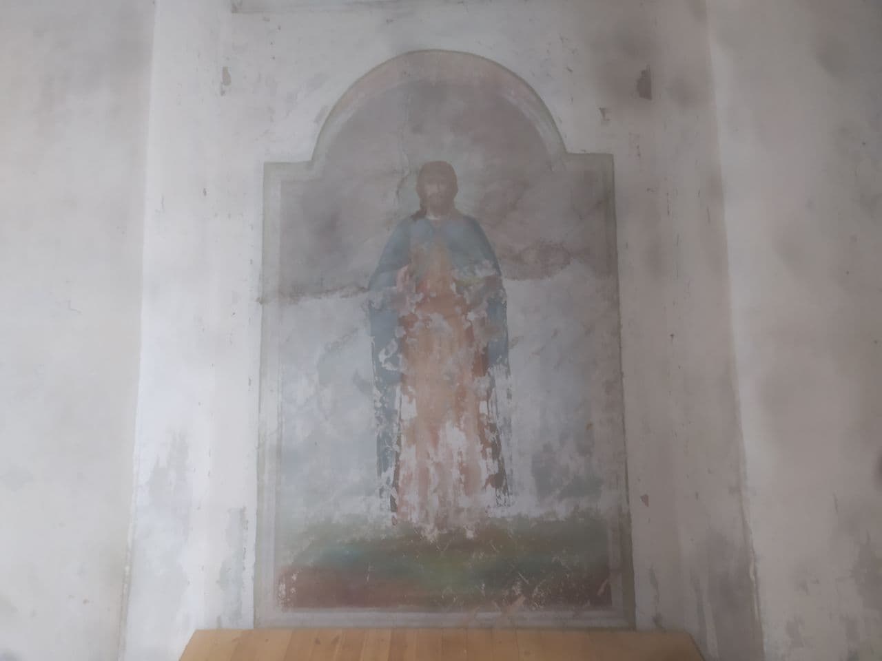 Фреска в Свято-Никольском храмеФото: Дмитрий Сидоров Основная часть старинного — XIX века постройки — Свято-Никольского храма запечатана с тех пор, как в конце октября Кинешемская епархия РПЦ запретила старца Иоанникия в служении, спустя несколько десятилетий его настоятельства здесь. Но и в передней его части можно полюбоваться на фрески позапрошлого века с Христом и Троицей. И на приделанный уже в этом веке к стене гроб с надписью: «Алкоголик наркоман — вот что ждет нас всех» по бортикам.