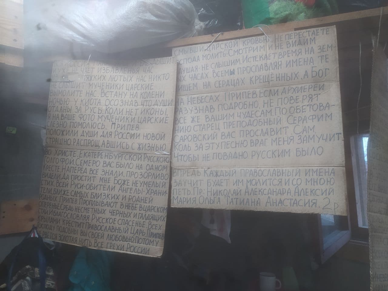 Тексты Жанны Бичевской в кормовом цехуФото: Дмитрий Сидоров Всюду в Чихачеве иконы и другие изображения Николая II, новый храм назван в честь него же, в кормовом цехе — транспаранты с текстом песни исполнительницы антисемитского фолка Жанны Бичевской про грядущего Царя-спасителя. Но трудники уверяют, что никакого царебожества, веры в искупительную роль Николая II они не практикуют и почитают последнего царя просто как официально канонизированного Русской православной церковью мученика.