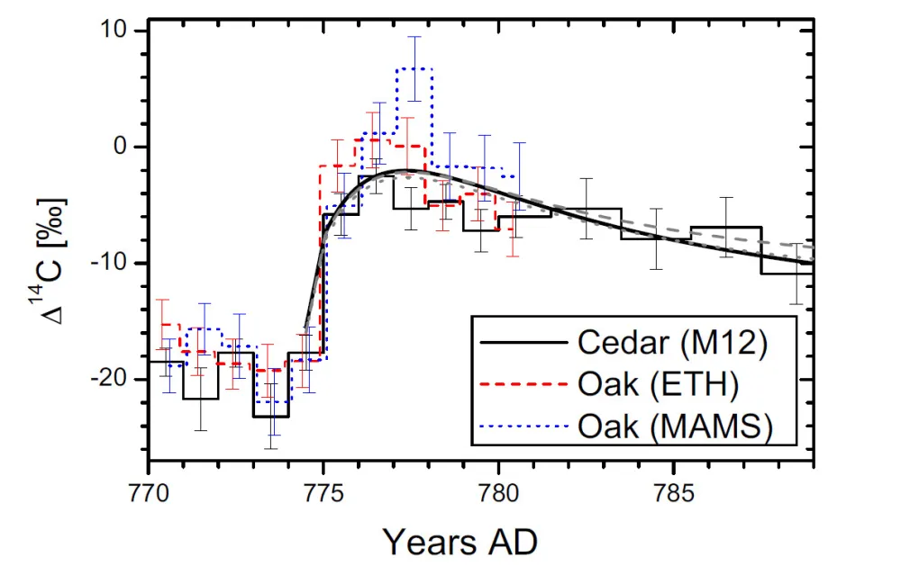 Событие Каррингтона — самая сильная вспышка за время инструментальных наблюдений, но далеко не самая сильная в исторические времена. В 775 году произошел подброс содержания радиоактивного изотопа 14С в кольцах деревьев (дуб и кедр) и изотопа 10Ве в годовых слоях гренландского льда. Эта вспышка была по меньшей мере в 40 раз сильней, чем любая из вспышек, зарегистрированных в космическую эпоху, и превосходила по энерговыделению 1033 эрг.