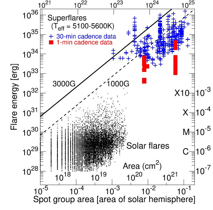 Звездные супервспышки вместе с измеренными солнечными вспышками показаны на рис. 4. Облако событий «Кеплера» лежит достаточно далеко и отделено от облака солнечных вспышек большим промежутком. Эти облака представляют разные явления или одно и то же, искаженное наблюдательной селекцией? Может ли распределение интерпретироваться так, что «Кеплер» не видит слабых вспышек, а наблюдения за Солнцем слишком коротки по времени, чтобы на нем произошли сильные? Пожалуй, нет. Скорее всего, это все-таки разные явления, но распространяется ли второе из них, катастрофическое, на звезды типа Солнца и, может быть, на наше Солнце?