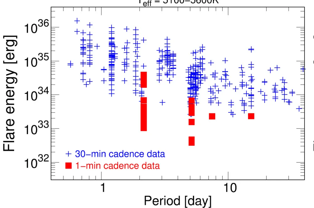 На рис. 5 показано распределение мощности вспышек в зависимости от скорости вращения звезды. Слева — молодые, быстро вращающиеся звезды класса G, справа — медленно вращающиеся, старые. Период обращения Солнца — 24 дня. Видно, что есть отрицательная корреляция между периодом вращения и мощностью супервспышек, но всё равно последние дотягивают до 1035 эрг и у медленно вращающихся звезд. Данные Gaia и наземного телескопа APO 3.5 m не демонстрируют какого-либо отличия тех звезд от Солнца.