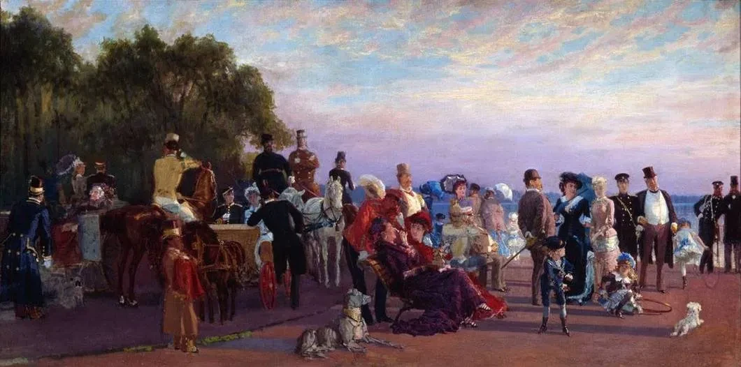 История картины «На стрелке» интересна: Савицкий работал в тот момент над заказом Третьякова, очень серьезной картиной, задержался в Петербурге, чтобы ее закончить, и в какой-то момент поехал отдохнуть, ему понравился сюжет: толпа, закат… трудно назвать это пленэром, но что-то французское в этом есть.