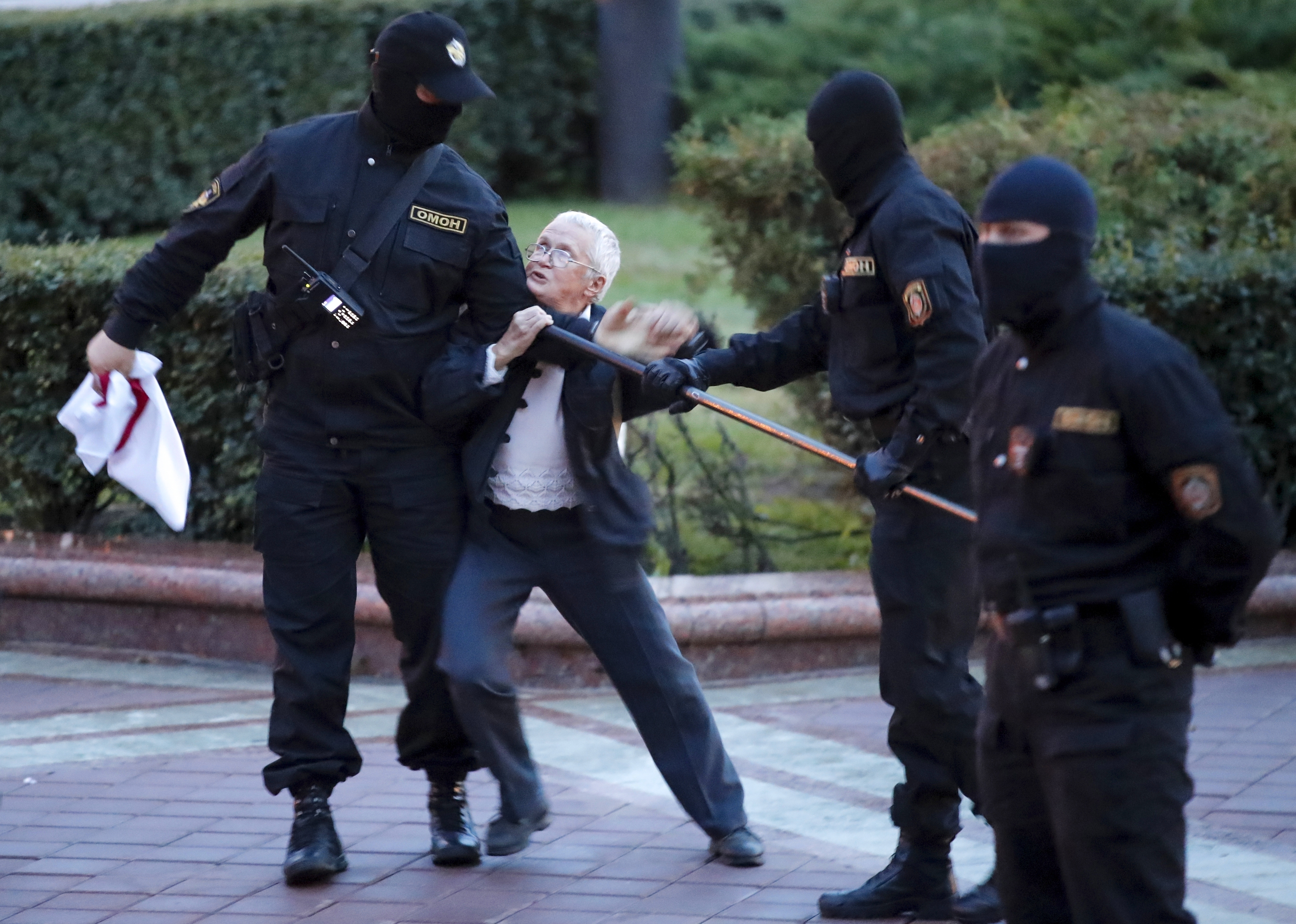 – Мы с молодежью общались, прошлись возле Института физкультуры, потом было решено идти к политеху, там кричать. Когда мы подошли к БНТУ, из первой больницы напротив в знак солидарности с нами вышли медики с бело-красно-белыми флагами и лентами. Мы начали их приветствовать и кричать: "Держитесь!" И тут подогнали большие автозаки, стали из колонны медиков выдергивать людей и бросать их в машины. Мы, старые и не ходим по проезжей части, только по тротуару, но тут мы кинулись через дорогу им на выручку. Из милицейских рупоров кричали: "Освободите проезжую часть!", и вот тогда эти черные пустили в нас газ, гранату бросили, он очень едкий, разъедает сразу слизистые. В полуметре от меня в офицерской машине открылось окно, показалась рука с пистолетом и выстрелила в воздух. А я говорю ему: "Что, стрелять начал, зараза? В небо, да? Стреляй уже в меня тогда!" Я литературно ругаюсь, называю их суками. Это по словарю Ожегова литературная брань, это не мат, это можно. Потому что кто такие суки? Те, что продают свою совесть за деньги. Это их особенно бесит, потому что в тюремном жаргоне суки – это не мужчины, а опущенные, падшие, ссученные. Это больше оскорбительно для них, чем если бы я их на три буквы послала.