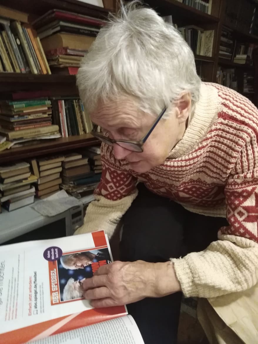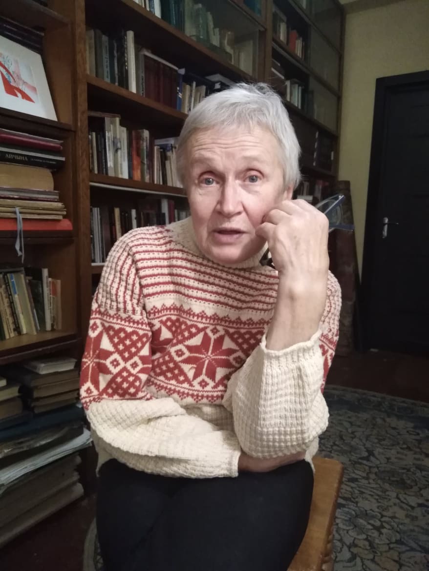 Связь мы держим через ее сына Павла, так как ни мобильного, ни интернета Багинская не признает ("Куда мне, я не люблю технику, я – естественник-романтик"). Она встречает меня у себя дома и уговаривает взять с собой антоновские яблоки, которыю сама выращивает в деревне (две дачи у нее конфисковали в счёт штрафов, потому что она принципиально их не платит). На столе стоит ваза с белыми и красными розами. Повсюду книги. На Нине связанный ею 30 лет назад свитер с белорусским орнаментом, прохудившийся, с висящими нитками, но любимый (его носил в школу сын).