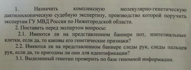 «Мемориал» отмечает, что 14 ноября — в день задержания нацбола — по делу была назначена комплексная молекулярно-генетическая дактилоскопическая судебная экспертиза. Ее поручили провести экспертам ГУ МВД по Нижегородской области. Специалисты должны будут проанализировать баннер на наличие следов пота и клеток эпителия, рук и пальцев рук, а выделенный генотип проверить по базе геномной информации.