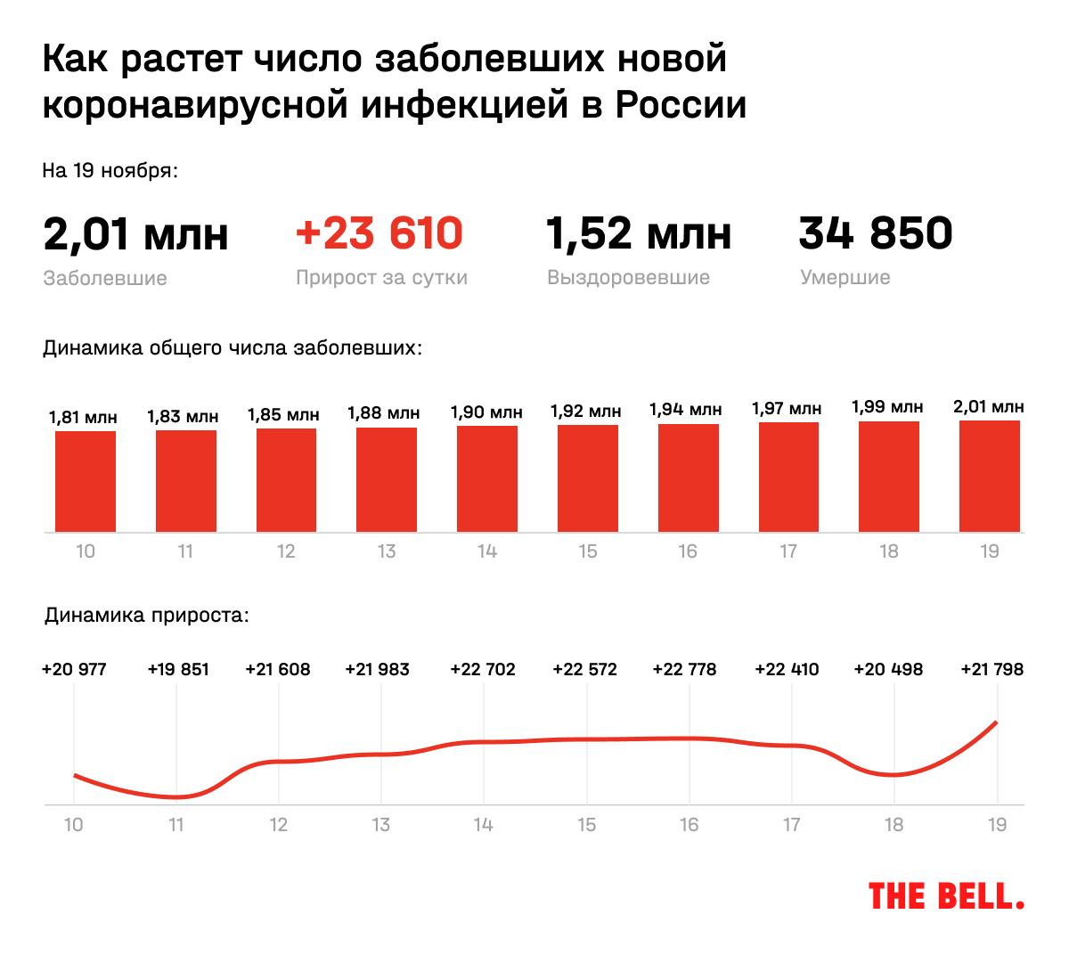 Общее количество заразившихся коронавирусом в России превысило 2 млн человек. За сутки к 19 ноября выявлено еще 23 610 случаев COVID-19.