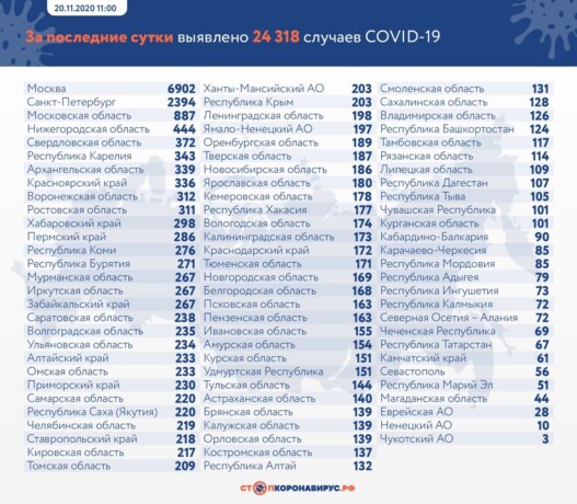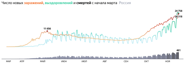 В России установлен новый рекорд по числу заболевших коронавирусом за сутки — 24 318 человек. Умер 461 человек. Об этом сообщил оперативный штаб.
