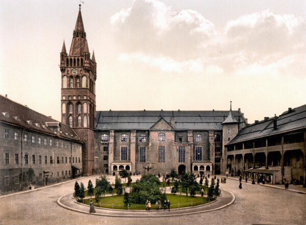 Замок имел форму прямоугольника с четырьмя башнями, внутренним двором и храмом. На территории был также госпиталь и приют для пожилых рыцарей. Кёнигсбергский замок неоднократно перестраивался из-за разрушений в ходе войн и предположительно из-за пожаров. Изначально скромные фасад и интерьеры зданий менялись, становясь всё более «светскими»: залы расширяли и дополняли лепниной и росписями, а окна увеличивали.
