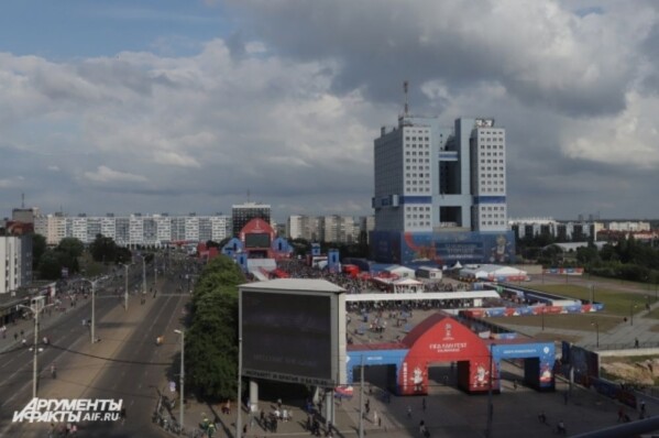Во время чемпионата мира по футболу-2018 вокруг Дома Советов организовали фан-зону: доступ в само здание был, как всегда, запрещён, но рядом с ним установили огромный экран для просмотра матчей.