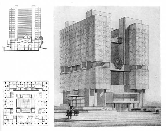 В стороне от фундамента снесённого замка советские власти решили построить Дом Советов, который бы мог затмить своим величием прусскую резиденцию. В начале 1950-х тогдашний главный архитектор города Дмитрий Навалихин предлагал возвести в центре Калининграда аналог сталинских высоток, однако проект не одобрили. Архитекторы по-разному представляли партийное здание, но не менялось одно: огромные масштабы и брутальность.