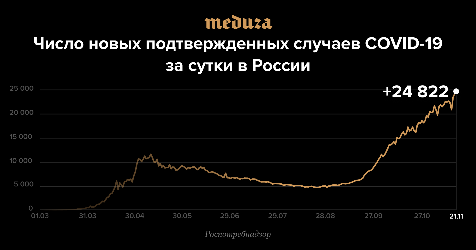 В России за сутки выявили 24 822 новых случаев COVID-19. Это максимальный суточный прирост заболевших с начала пандемии