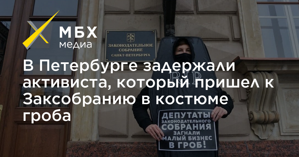 В Петербурге полицейские задержали активиста, который пришел к зданию Законодательного собрания в костюме гроба, чтобы провести пикет в защиту малого и среднего бизнеса. Об этом сообщает «Северо-Запад. МБХ медиа».