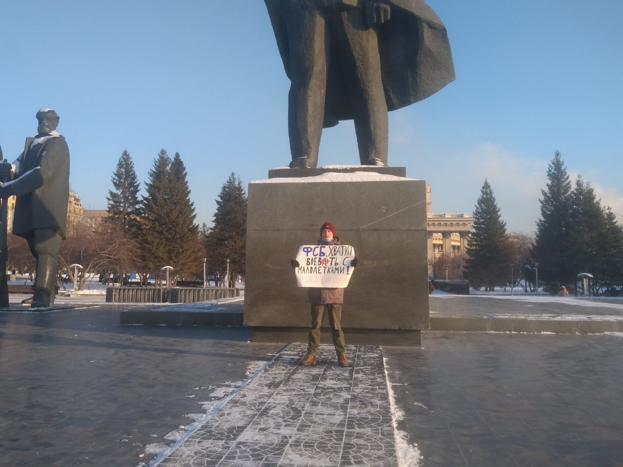 Житель Новосибирска вышел на пикет против ФСБ. Он развернул на центральной площади города у памятника Ленину плакат "ФСБ, хватит воевать с малолетками!".