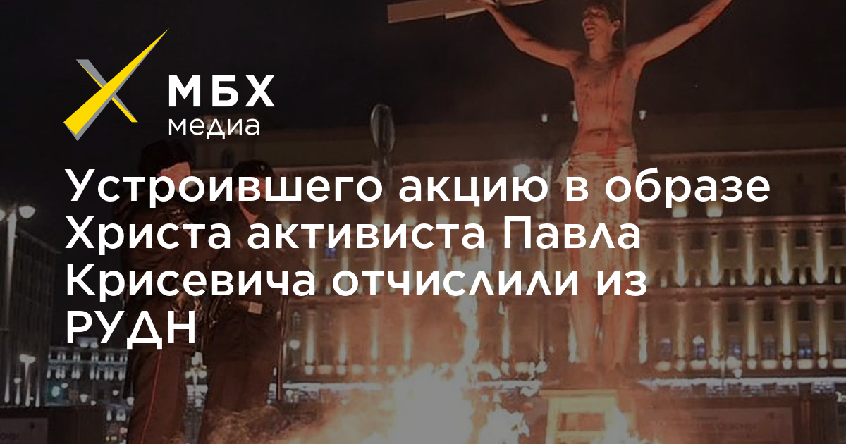 Ректор РУДН выпустил приказ об отчислении студента университета Павла Крисевича, который устроил акцию в образе Христа в поддержку политзаключенных. Об этом «МБХ медиа» сообщил сам Крисевич.