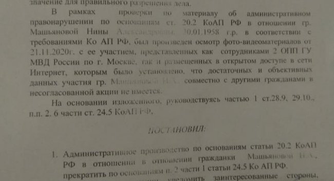 4 декабря Машьянова посетила отдел полиции, где ей выдали документ о прекращении административного производства по статье о нарушении порядка проведения акции (ст. 20.2 КоАП) по основанию, предусмотренному п. 2 ч. 1 ст. 24.5 КоАП, — отсутствие состава административного правонарушения.