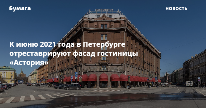 К июню 2021 года в Петербурге отреставрируют фасад гостиницы «Астория»