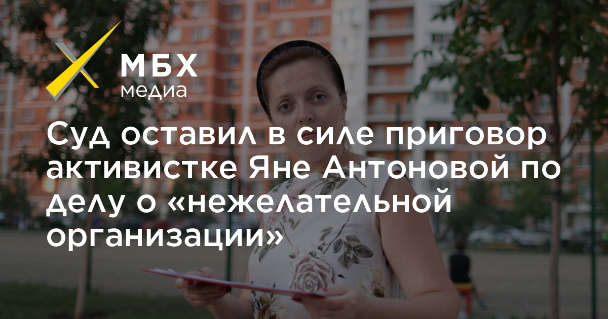 Суд в Краснодаре оставил в силе приговор бывшему координатору «Открытой России» Яне Антоновой, которой назначили 240 часов обязательных работ по уголовному делу об участии в деятельности «нежелательной организации» (статья 284.1 УК). Об этом сообщил «МБХ медиа» координатор «Правозащиты Открытки» Алексей Прянишников.