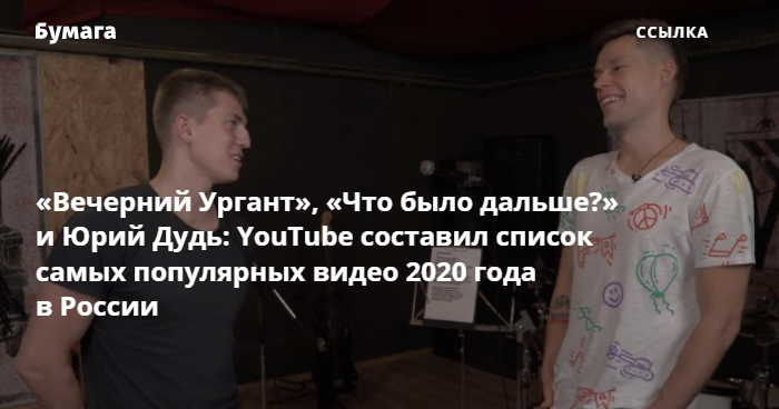 Первое место занял выпуск шоу «Что было дальше?» с участием Лолиты Милявской, второе место — интервью с комиком Алексеем Щербаковым у Дудя, третье — эпизод «Вечернего Урганта», гостем которого стал рэпер Morgenshtern. В пятерку самых просматриваемых роликов также попали видео блогера Mamix об опарышах, которые едят бургер, и челлендж Влада А4 о школе.