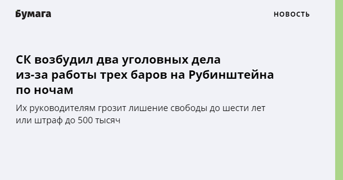 Следственный комитет России возбудил два уголовных дела в отношении неустановленных руководителей трех баров на улице Рубинштейна в Петербурге, которые якобы работали по ночам. Об этом говорится на сайте СК.