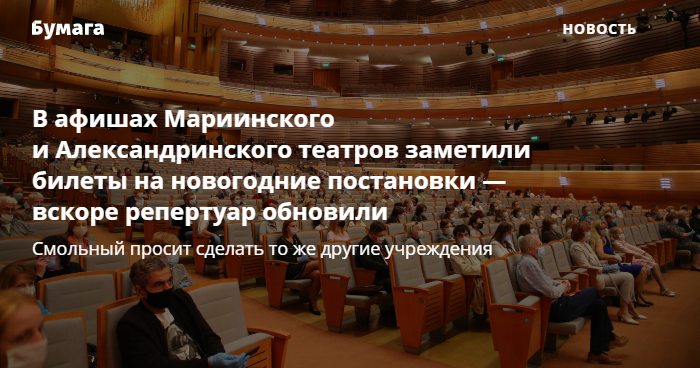 К 9 декабря афиши обоих театров обновили, заметила «Бумага». В Мариинском театре нельзя купить билеты на постановки, запланированные в период с 21 декабря по 14 января. Из репертуара Александринского театра пропали спектакли с 30 декабря. В январе в Александринском, судя по афише на сайте, пока запланировано лишь «Лебединое озеро» — 11-го числа.