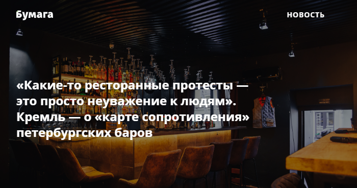Пресс-секретарь президента России Дмитрий Песков прокомментировал создание «карты сопротивления» баров Петербурга, которые якобы намерены работать вопреки ограничениям Смольного. Об этом пишут «РИА Новости» и «Пятый канал».