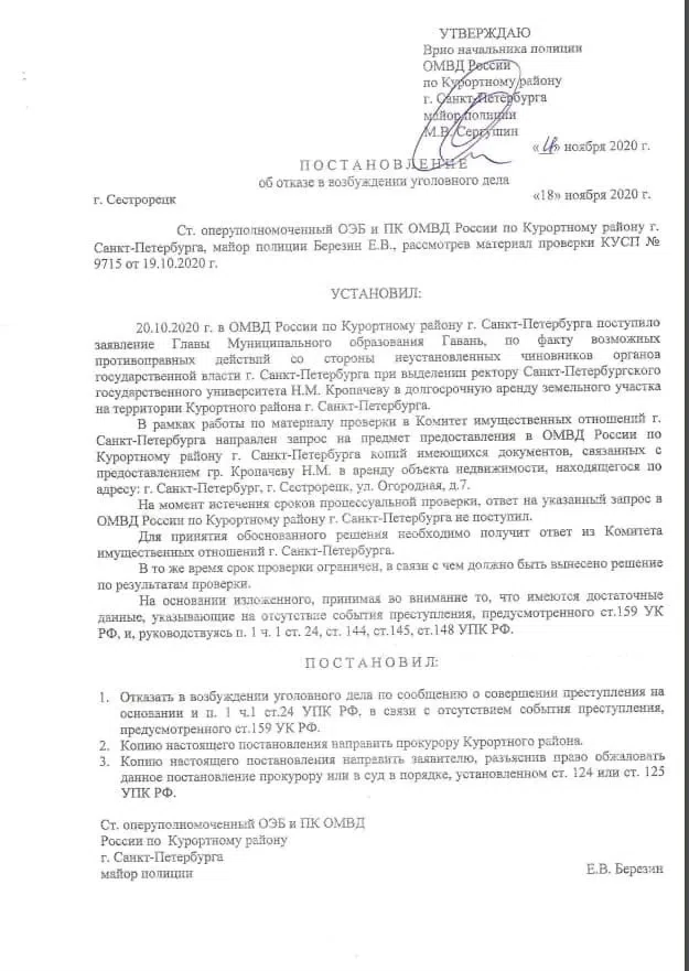 Ответ из ОМВД Курортного района, датированный 18 ноября, был доставлен Нэлли Вавилиной почтой 14 декабря. Как следует из постановления, старший оперуполномоченный отдела по экономической безопасности и противодействия коррупции, начав проверку, направил запрос в КИО Петербурга с требованием предоставить копии документов, «связанных с предоставлением гр. Кропачеву Н. М. в аренду объекта недвижимости». Как указано в постановлении, до истечения срока проверки (30 суток) ответ из КИО не поступил.