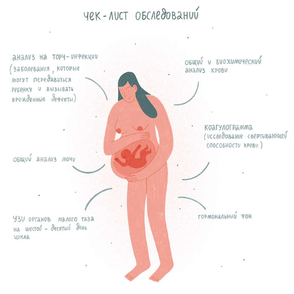 Елизавета Новоселова приводит чек-лист обследований, которые в идеале стоит сделать за три — шесть месяцев: общий и биохимический анализы крови, коагулограмма (исследование свертывающей способности крови), гормональный профиль, анализ на торч-инфекции (заболевания, которые могут передаваться ребенку и вызывать врожденные дефекты), общий анализ мочи. А также УЗИ органов малого таза на шестой — десятый день цикла.