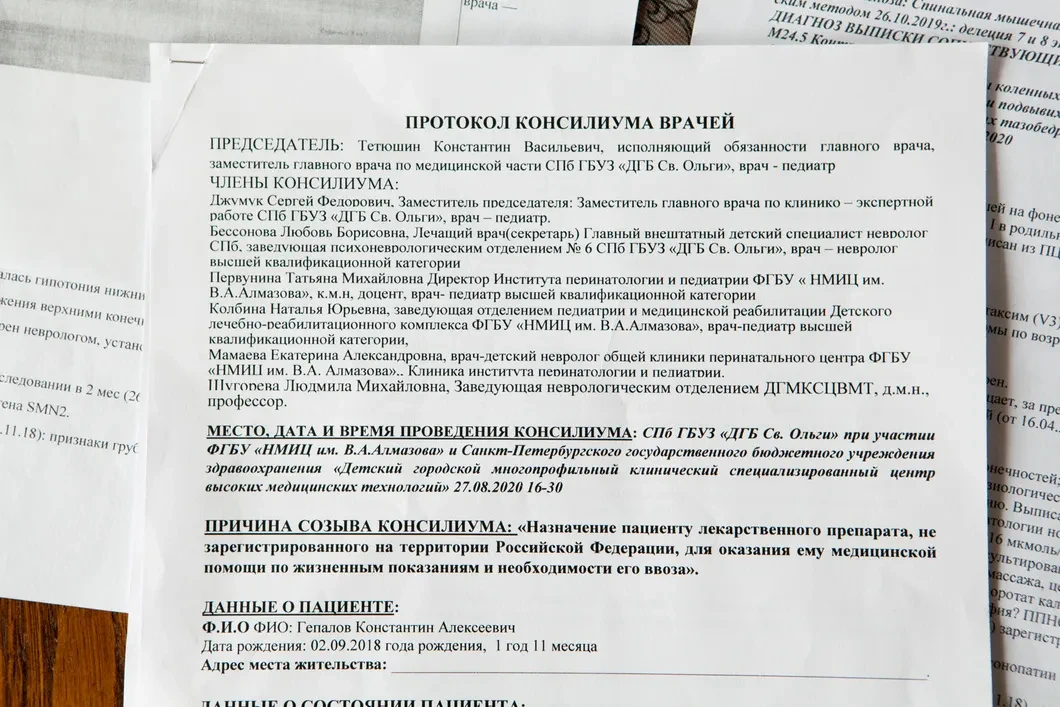 В августе Гепаловы обратились в Куйбышевский райсуд с требованием обеспечить их ребенку лекарственный препарат от СМА. Родители опирались на заключения двух врачебных консилиумов: регионального (вынесенного в феврале 2020 года в петербургской больнице Святой Ольги) и федерального (озвученного в апреле 2020 года в Национальном медицинском исследовательском центре им. Алмазова). Оба рекомендовали Косте лечение «Золгенсмой».