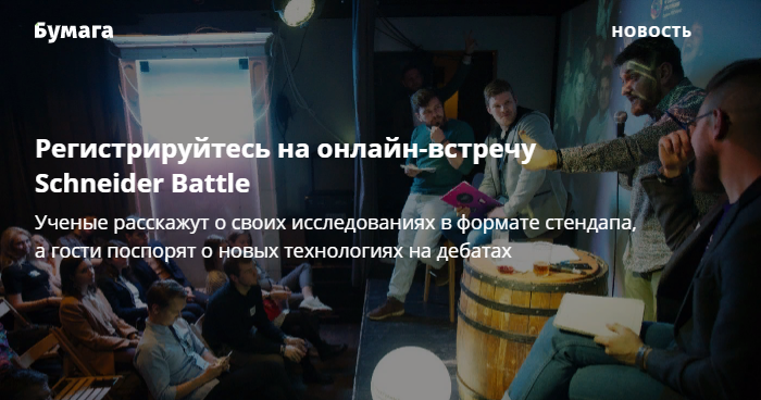 «Бумага» и компания Schneider Electric проводят онлайн-встречу Schneider Battle, во время которой молодые ученые поделятся результатами своих исследований в формате стендапа. В ходе встречи также можно будет поучаствовать в дебатах и мастер-классе по составлению качественного резюме.