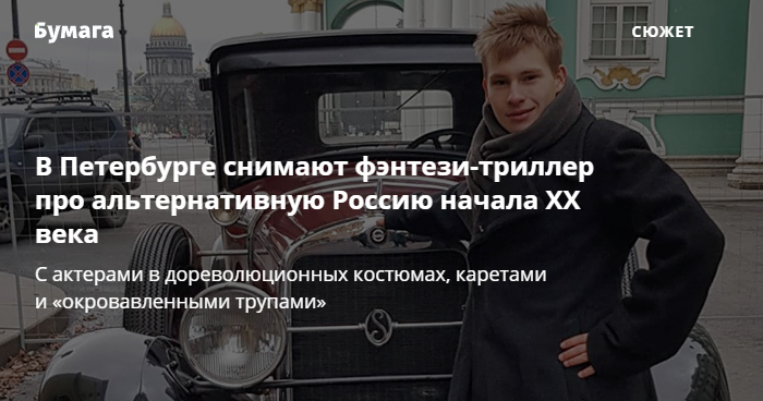 В Петербурге снимают фэнтези-триллер «Карамора», действие которого разворачивается в альтернативной России в начале XX века. Горожане фотографируют актеров в дореволюционных костюмах и ретроавтомобили у Эрмитажа, а у Петропавловской крепости заметили «окровавленные трупы».