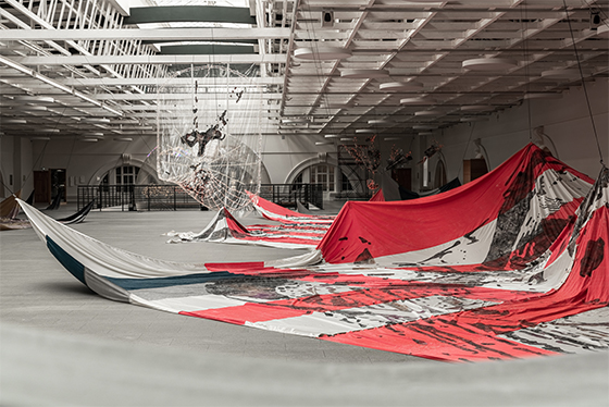 Инсталляцию «Цирк» кураторы обозначили как ландшафт, то есть ритм подвешенных, подтянутых, вздернутых полотнищ. Но мне кажется важнее не то, что над, а то, что внутри этих демонтированных шатров. Они могут быть просто тряпочкой, послушно тянущейся по полу вдоль стены, а потом дерзко лизнувшей вашу коленку, могут быть угловатой берлогой или грустно опавшим шалашом из детства — и тут стоит не только созерцать ландшафт, а почувствовать себя этой тряпочкой, прожить этот ритм вздергиваний и опаданий. Отличная метафора психологической неустойчивости и — уязвимости.
