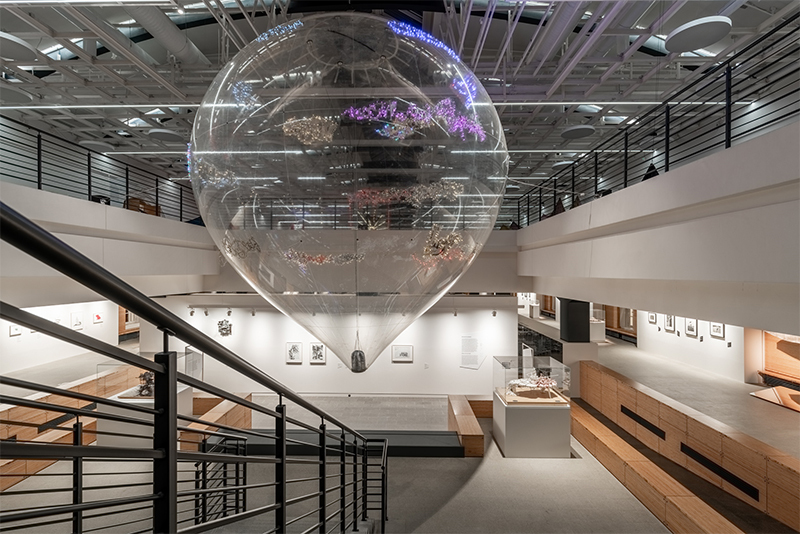 Чисто визуально «Утопия» тоже не давит — здесь много аккуратного света, прихотливых, но тактично выстроенных зеркал, удачный лаконизм материалов (сталь, стекло, зеркала, чуть меньше ткани и совсем немного дерева). Наконец, много воздуха и (относительно) не заумные экспликации. Поэтому странно, что некоторые по инерции называют выставку блокбастером: все-таки в нашем понимании это обычно более плотные, настойчивые и взвинченные проекты.