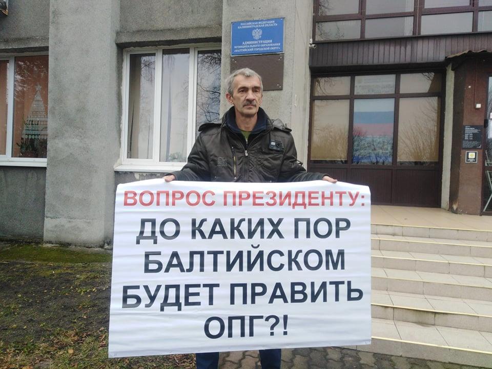 Активист Сергей Дустин вышел на одиночный пикет к администрации Балтийска в день большой пресс-конференции президента России Владимира Путина, сообщает корреспондент Север.Реалии. На акцию он принес плакат с надписью "До каких пор Балтийском будет править ОПГ?". Вопрос активист адресовал главе государства.