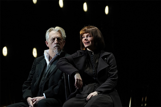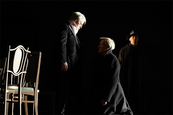 Пустой планшет сцены в начале занят лишь сваленными слева стульями — ненавязчивым знаком обезлюдевшего мира (или тех изъятий, которые претерпел спектакль за четыре года работы?). Возможно, они сметены подвижной фурой-стеной, начиненной сотами света. Художники придумали свой оригинальный ответ на великий занавес-время Давида Боровского, связанный из тяжелой шерсти и сметавший в таганском «Гамлете» обитателей Эльсинора. Занавес «Карамазовых» вносит в пространство спектакля тему света как последнего суда, десятками софитов просвечивая персонажей (а на мгновение и зрителей) насквозь, но и размывая их уникальные свойства, сливая в нечто единое.