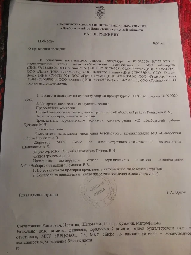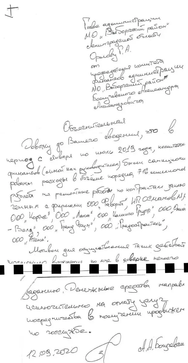 Чекисты начали проверять деятельность Болучевского в администрации. И обнаружили хищения (подробности — в «Новой» № 105 от 25 сентября 2020). 7 сентября прокуратура направила в администрацию Выборгского района запрос с требованием предоставить определенные документы. Прокурорский запрос встревожил главу администрации Выборгского района Геннадия Орлова. 11 сентября он подписал распоряжение «О проведении проверки», а 12 сентября, в день выборов губернатора Ленинградской области, вызвал к себе Болучевского, включил диктофон и лично допросил подчиненного.