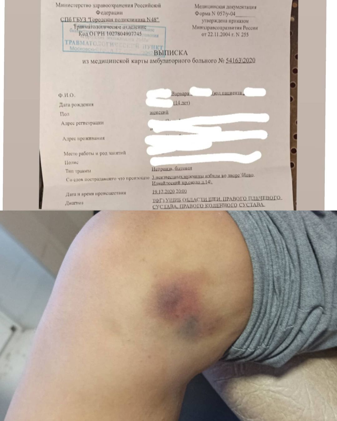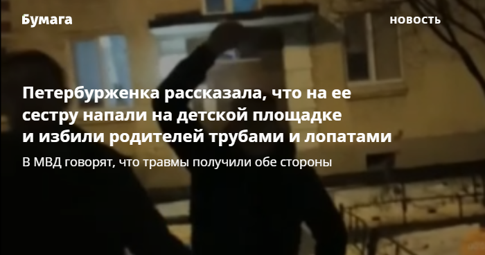 Петербурженка Виктория Подольская сообщила, что трое мужчин напали на ее сестру на детской площадке, а также трубами и лопатами избили ее родителей, которые пытались вступиться за подростка. Подробный рассказ опубликован в инстаграме девушки. Точная причина конфликта не ясна.