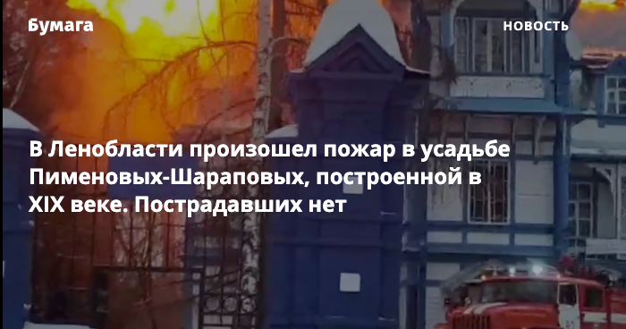 В Ленобласти произошел пожар в усадьбе Пименовых-Шараповых, построенной в XIX веке