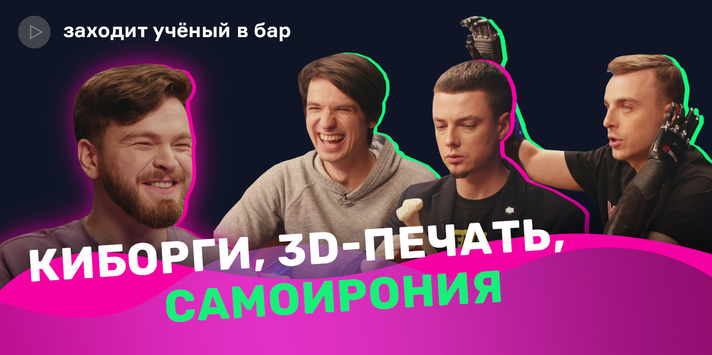 В этом выпуске научно-популярного шоу «Заходит ученый в бар» инженеры Илья Чех и Федор Сенатов сидят в баре с настоящим киборгом — блогером Константином Дебликовым. Раскрываем секрет того, как управлять протезами, и рассказываем, где появился первый кот-киборг. Бонусом — удивительная история Кости о потере конечностей.
