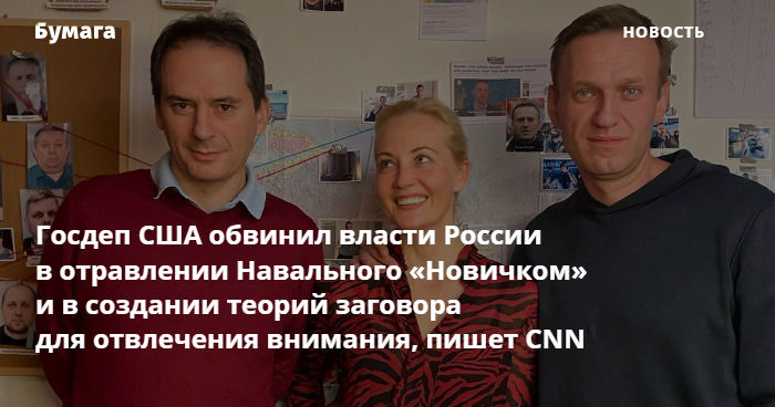 По данным CNN, Госдеп США считает, что сотрудники ФСБ России использовали нервно-паралитическое вещество «Новичок», чтобы отравить Навального. К этому якобы причастно правительство России. «Нет никакого правдоподобного объяснения отравлению господина Навального, кроме участия и ответственности российского правительства. <…> Конечно, президент Путин и российское правительство хотят, чтобы мы считали иначе», — цитирует телеканал представителя департамента.