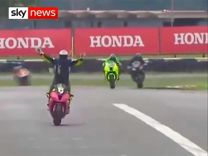 Motorcyclist Andre Verissimo celebrates prematurely as he is overtaken in the last stretch at Superbike Brasil.