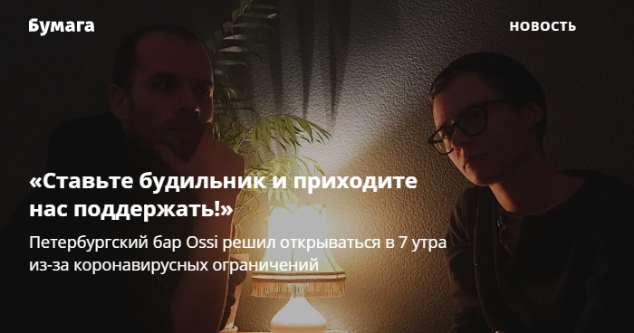 Такое решение в Ossi приняли из-за того, что сейчас общепиту в Петербурге запрещено принимать посетителей с 19:00 до 6:00. Ограничения не касаются только производственных столовых, заведений на вокзалах, в аэропорту и на заправочных станциях.