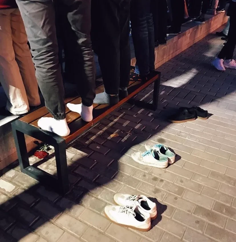 Молодежь Беларуси во время протестного митинга стоит на уличной скамейке, сняв ботинки, чтобы ее не запачкать. Фото: соцсети