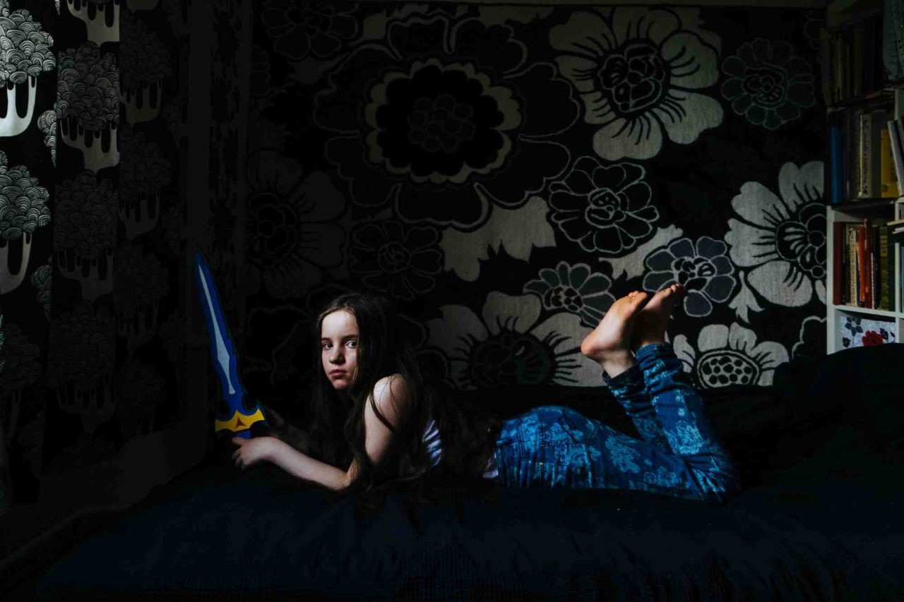Перед фотопроектом мы как раз вернулись из поездки, где Женя в очередной раз выбирала себе кинжальчики на барахолке — от покупки холодного оружия остановило нас только то, что мы летели назад «Победой». Женя взяла себе только маленький раскладной ножичек.