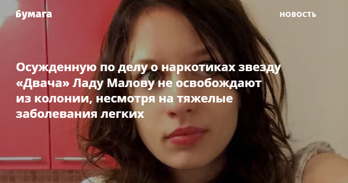 Осужденную по делу о наркотиках Ладу Малову из Петербурга, получившую известность на имиджборде «Двач», не освобождают из колонии, несмотря на несовместимые с пребыванием там тяжелые заболевания легких. Об этом рассказала «Медиазона».