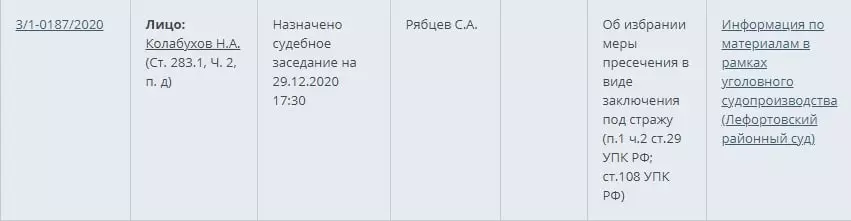Информация о том, что Колабухов арестован, появилась вечером 29 декабря в картотеке суда. Однако вскоре – меньше чем через час – карточка из базы суда пропала. К моменту выпуска новости она до сих пор там отсутствует.