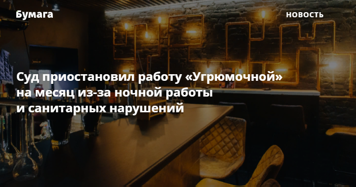Куйбышевский районный суд приостановил деятельность бара «Угрюмочная» на 30 суток. Об этом сообщает объединенная пресс-служба судов Петербурга.