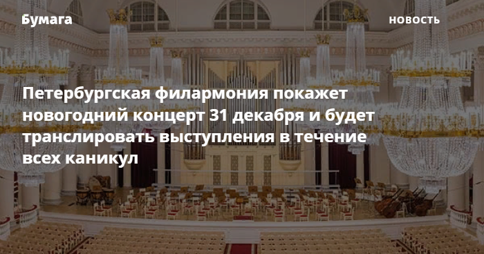 Петербургская филармония запускает серию трансляций концертов в новогодние праздники. Это сообщается на ее официальном сайте.