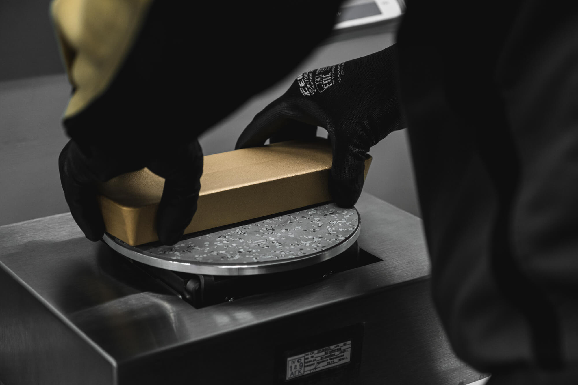 Чистое золото в слитках — тяжелый и одновременно мягкий металл. Даже ногти и мозоли на пальцах могут оставить повреждения, поэтому прежде чем забрать готовые слитки, клиенты осматривают их: ищут внешние повреждения и проверяют на соответствие ГОСТу. Любой брак означает, что слиток не будет принят и пойдет на переплавку, поэтому с ними работают аккуратно и исключительно в перчатках. Готовые слитки заворачивают в пленку и упаковывают в транспортные контейнеры. Что касается массы, то стандартный весит от 11 до 13,3 кг, но иногда красноярской компании заказывают и нестандартные слитки.