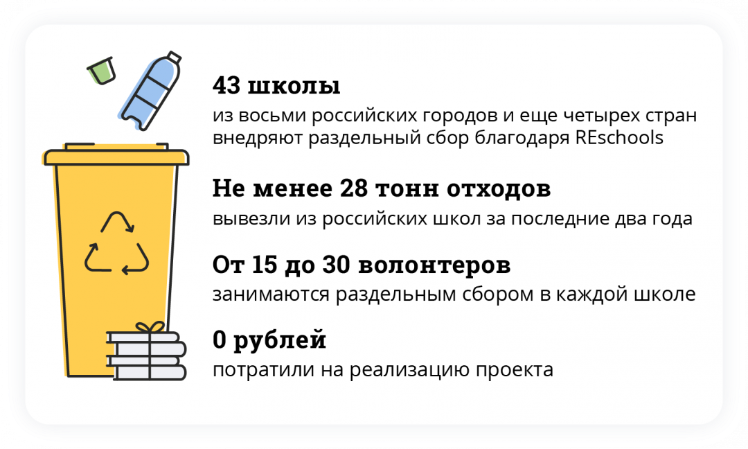 Через полгода существования системы в школе мы решили поделиться опытом с другими и создали REschools. Наша работа заключается в консультациях и предоставлении информации (плана действий, списка компаний, материалов для уроков). Иногда мы собираем ребят из разных школ, устраиваем мероприятия.