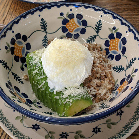 490 ₽ — греча с авокадо, пармезаном и яйцом пашот